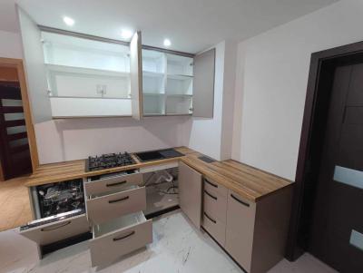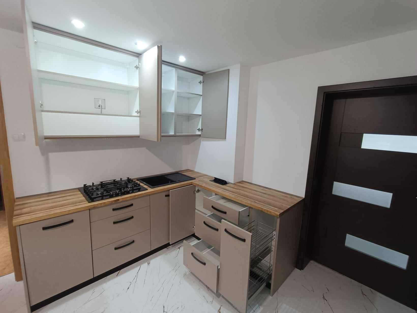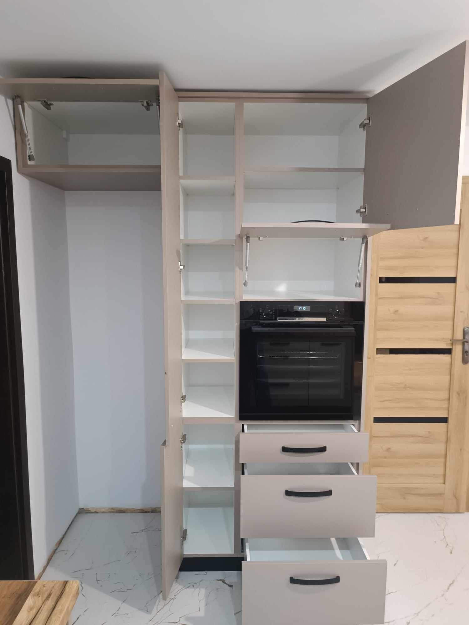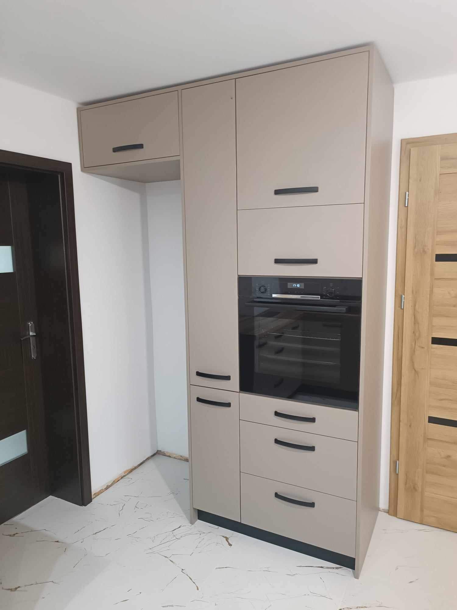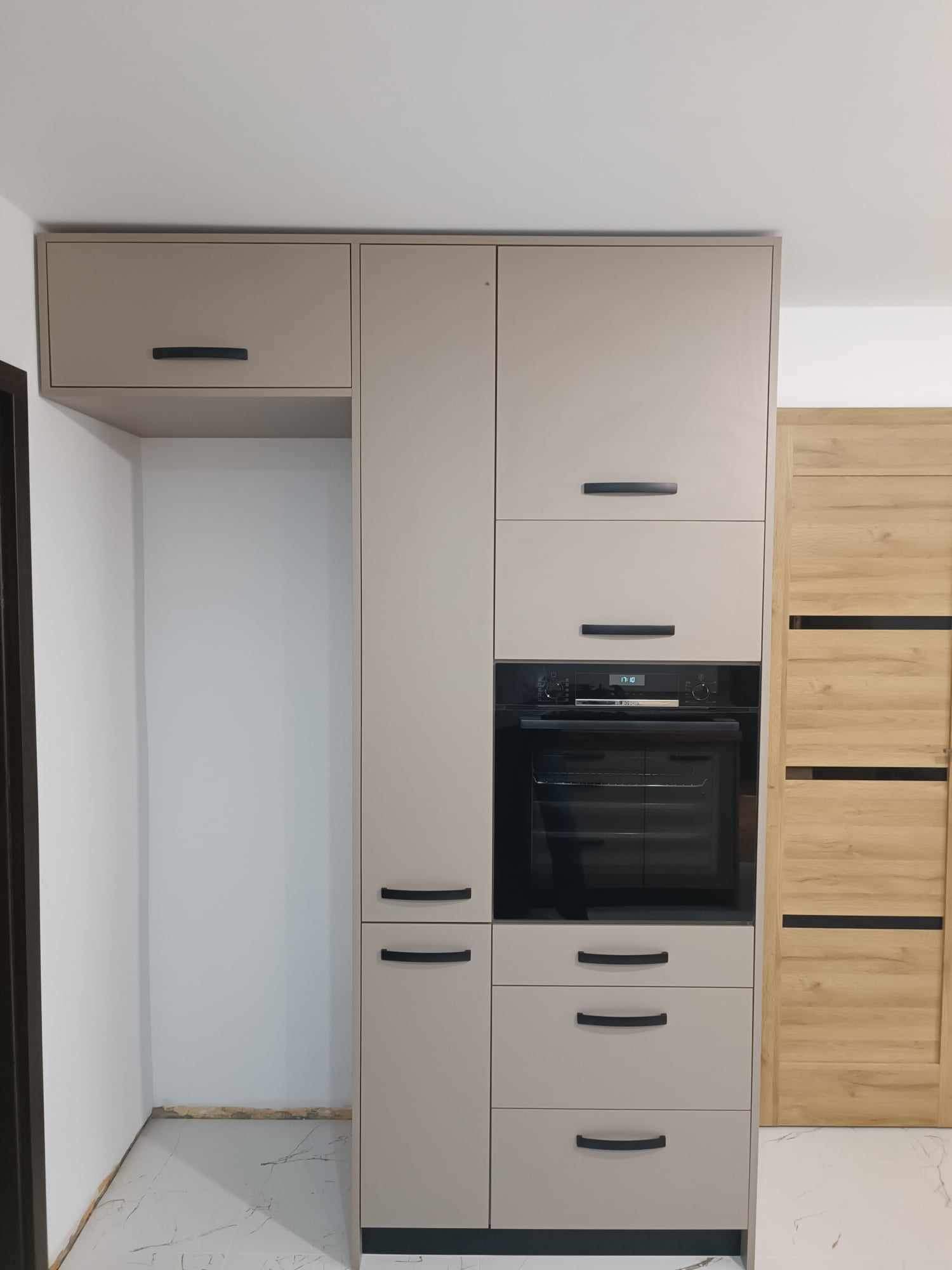 Kuchnia składa się z części głównej w kształcie litery L oraz wysokiej zabudowy piekarnika i lodówki. Fronty szafek stojących oraz wiszących wykonane z płyty Egger Szary Kamienny, blat Egger Dąb Hunton Jasny. Całości dopełniają czarne uchwyty i cokół.